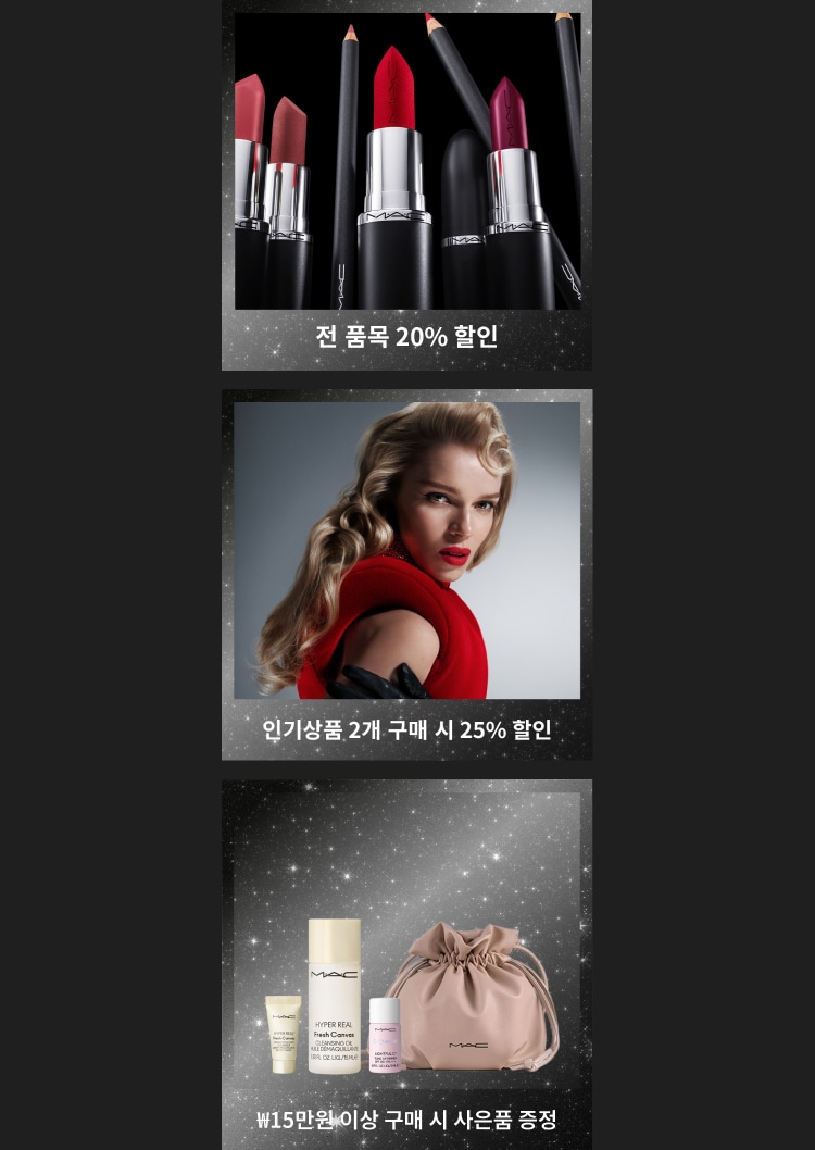 립 & 베이스 메이크업 세트 프로모션: MAC 베이스 제품 또는 립스틱 중 아무거나 2개 선택 시 25% 할인!