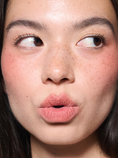 NEW 파우더 키스 새로운 헤이지 매트 립스틱과 멀티-우즈 립 + 치크 무스로 입술부터 치크까지, 흐릿하게 블러 처리된 완벽한 매트 컬러를 완성하세요.