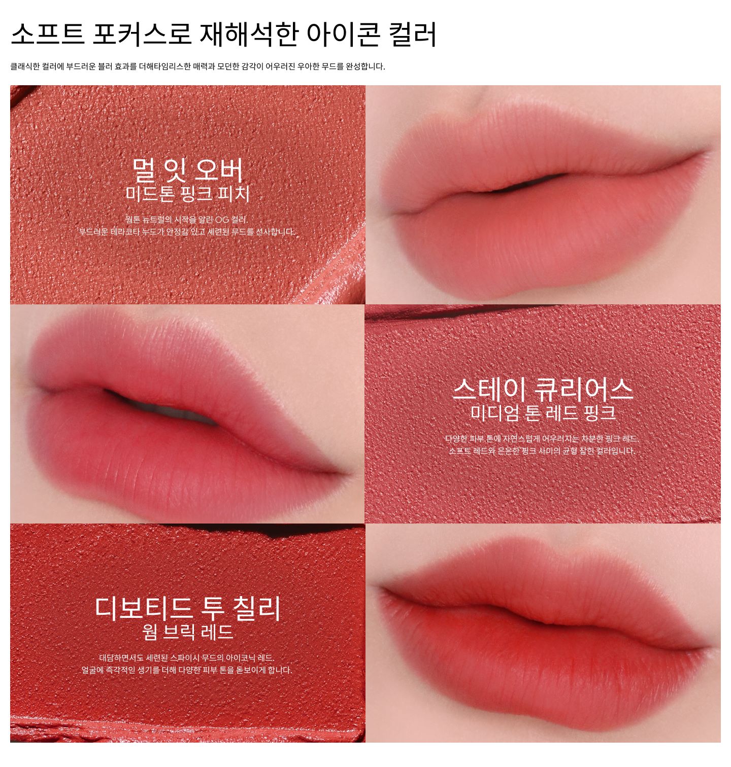 대담하면서도 세련된 스파이시 무드의 아이코닉 레드. 얼굴에 즉각적인 생기를 더해 다양한 피부 톤을 돋보이게 합니다.