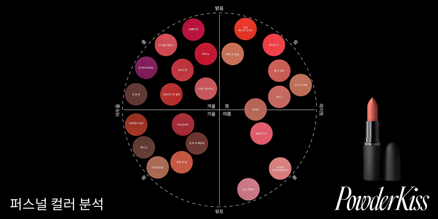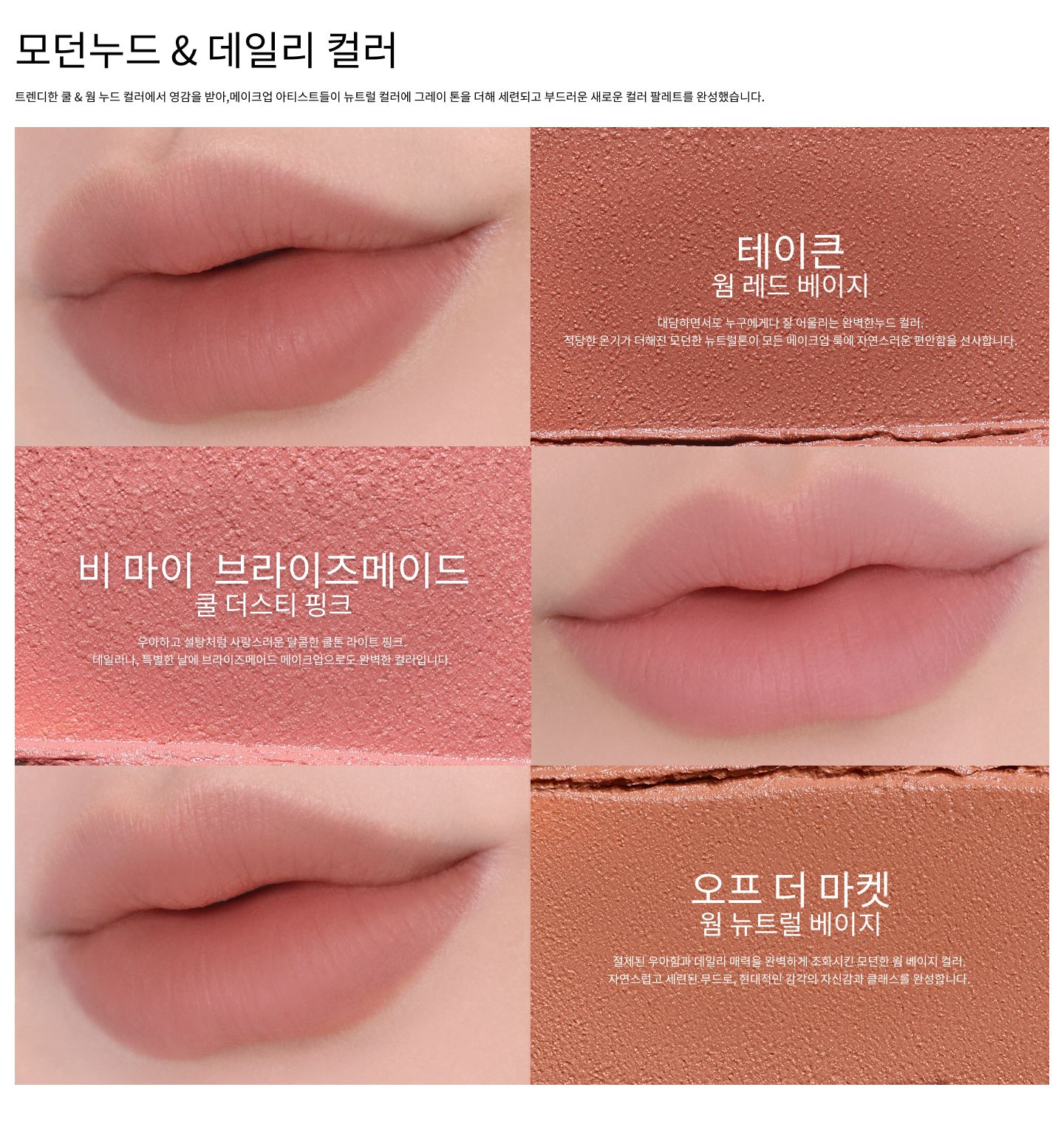 글로벌 패션 트렌드와 일상의 중요한 순간에서 영감을 받은 누드부터 데일리 아이코닉 컬러까지 제공된 모던 팔레트.