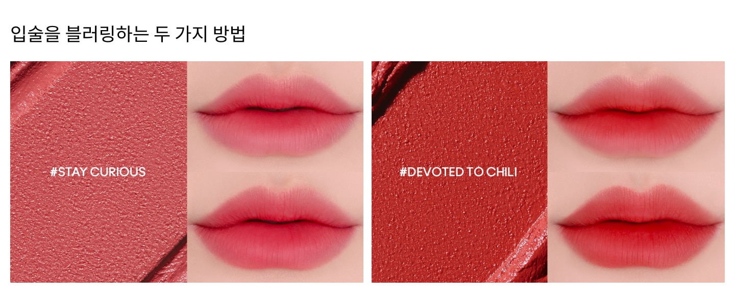 입술에는 디보티드 투 칠리 파우더 키스 매트 립스틱을, 입술과  치크에는 디보티드 투 칠리 립 + 치크 무스를 함께 사용해 보세요.